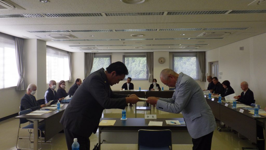 企業長(写真左)から坂本会長(写真右)へ諮問書を手交しました。